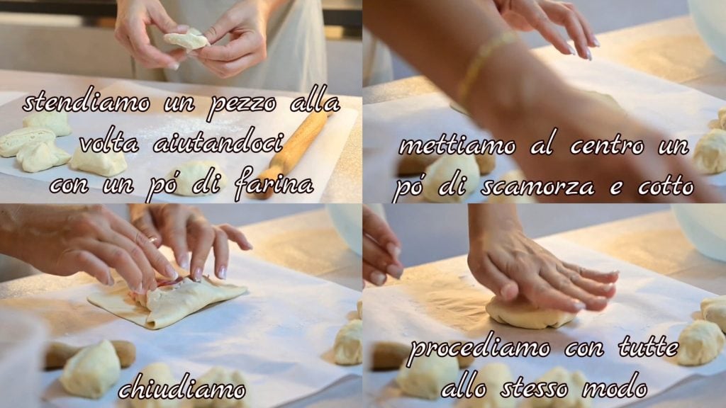 Wir nehmen ein Stück nach dem anderen und rollen es aus, dabei verwenden wir bei Bedarf etwas Mehl. In die Mitte legen wir etwas Scamorza und Kochschinken (je ca. 10 g) und schließen es gut, um ein Auslaufen während des Kochens zu verhindern. So verfahren wir auch mit den anderen Stücken.