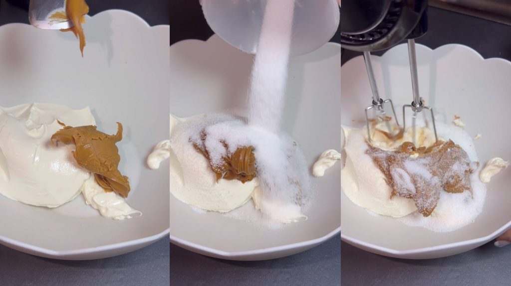 Als erstes gebe ich Mascarpone, Lotus-Creme und Zucker in eine Schüssel.
