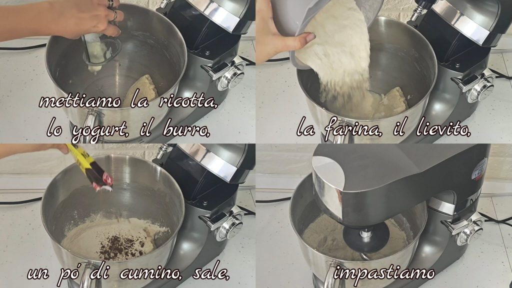 Ricotta, Joghurt, Butter, Mehl, Hefe, etwas Kümmel, Salz hineingeben und zu einem homogenen Teig kneten.