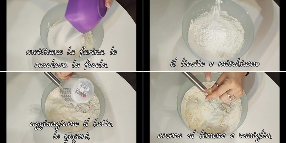 In eine Schüssel Mehl, Zucker, Kartoffelstärke und Backpulver geben und vermischen. Milch, Joghurt, Zitronenaroma und Vanille hinzufügen.