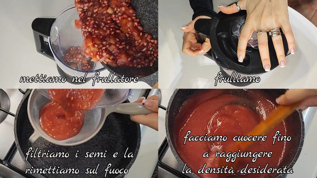 Geben Sie die entstandene Mischung in einen Mixer und pürieren Sie sie. Filtern Sie die Samen heraus und stellen Sie es zurück auf den Herd. Kochen Sie weiter, bis die gewünschte Dichte erreicht ist.