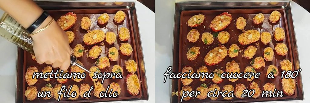 Wir fügen Parmesan, Semmelbrösel hinzu und mischen. Wir geben etwas Salz über die ausgehöhlten Kirschtomaten und füllen sie einzeln mit der vorbereiteten Mischung, dann legen wir sie auf ein Backblech.