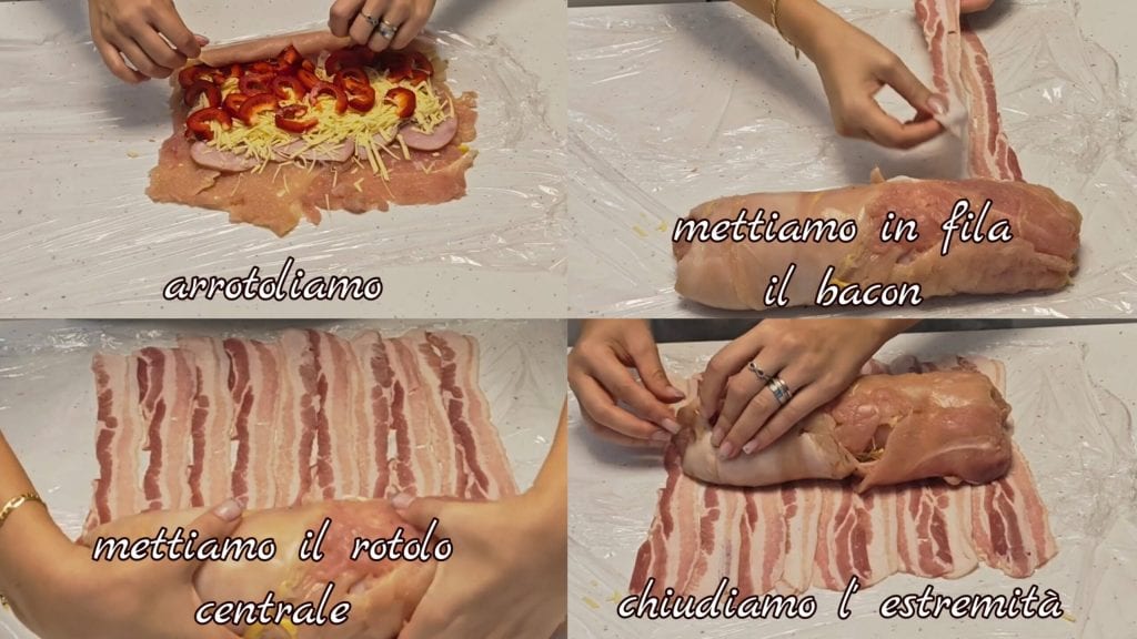 Eine herzhafte Rolle, perfekt, um sie als Hauptgericht auf den Tisch zu bringen, besonders zu Ostern und nicht nur. Ich habe mich entschieden, diese Rolle mit Hähnchenbrust zu machen und sie mit Paprika, gekochtem Schinken, Scamorza zu füllen und dann in Speckscheiben zu rollen, eine echte Köstlichkeit.
