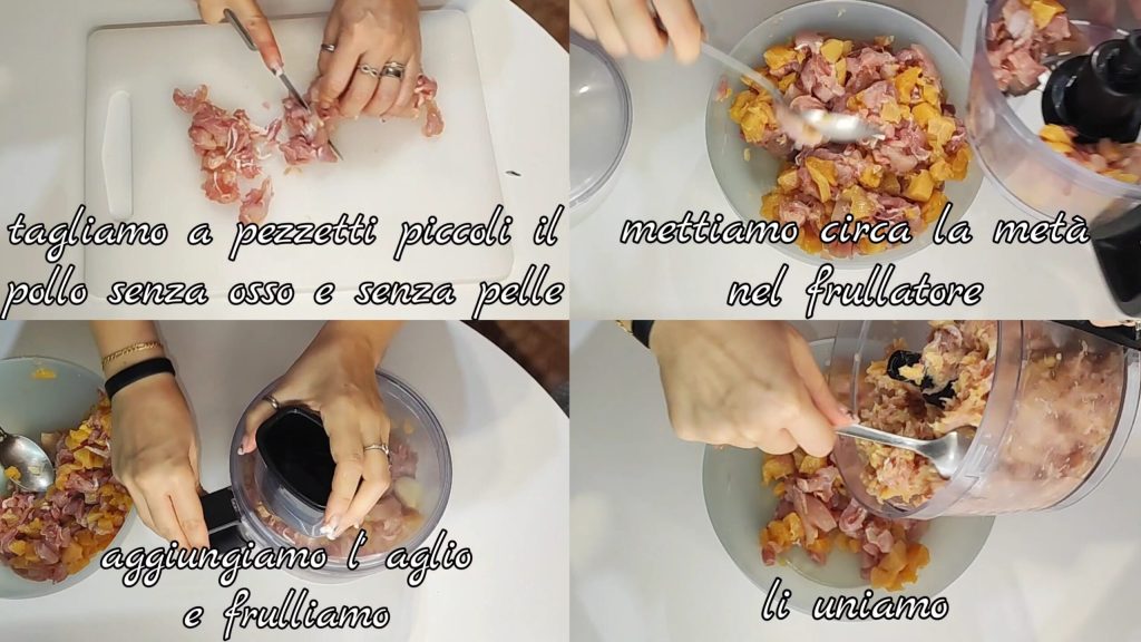Wir beginnen die Zubereitung, indem wir das Hähnchen ohne Knochen und Haut in kleine Stücke schneiden. Etwa die Hälfte in den Mixer geben, Knoblauch hinzufügen und mixen, dann die beiden Mischungen zusammenfügen.