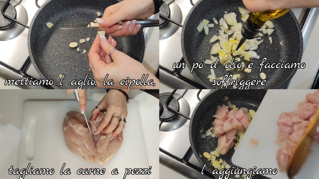 In einem Topf etwas Öl, Knoblauch und Zwiebel hinzufügen und anbraten. Schneiden Sie die Hähnchenbrust in Stücke und fügen Sie sie hinzu.