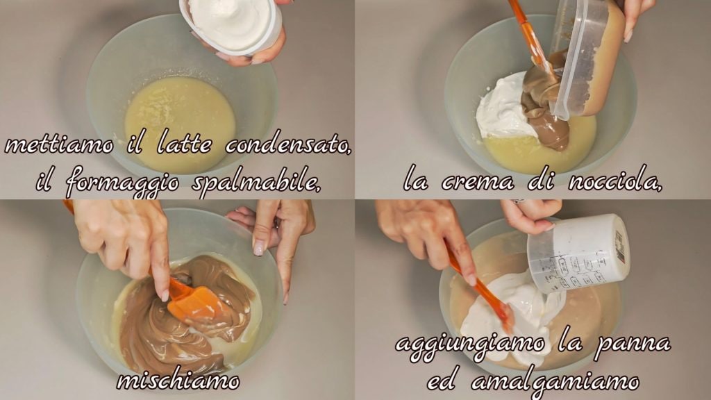 In einer Schüssel mischen wir die Kondensmilch, den Frischkäse, die zuvor zubereitete Haselnusscreme und mischen. Wir fügen die Sahne hinzu und mischen sie einige Minuten mit dem Schneebesen.