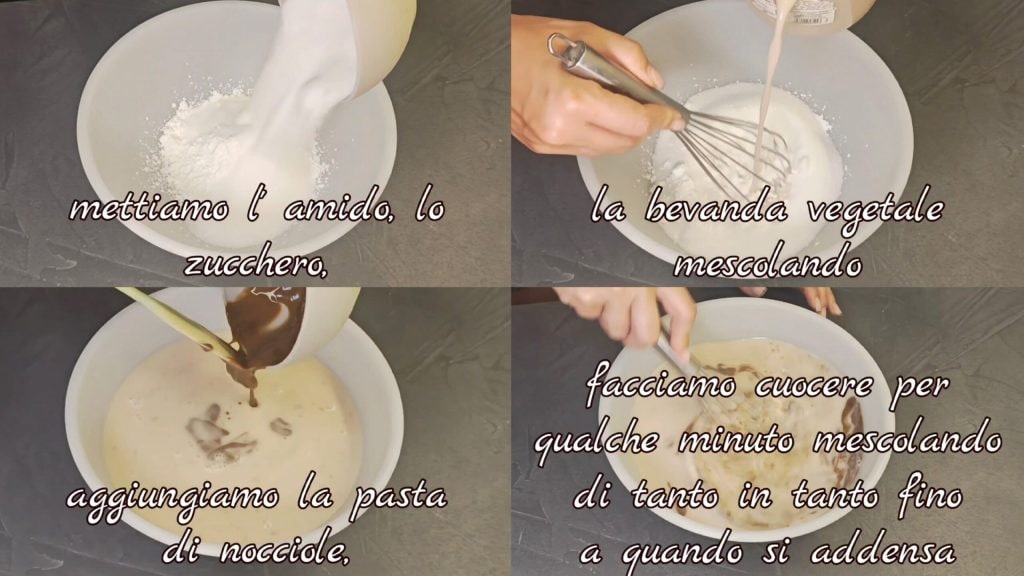 In einer Schüssel mischen wir die Stärke, den Zucker und das pflanzliche Haselnussgetränk. Wir fügen die Haselnusspaste hinzu und lassen sie einige Minuten eindicken. Sie können den Herd oder die Mikrowelle verwenden und die Creme jede Minute herausnehmen, um sie umzurühren.