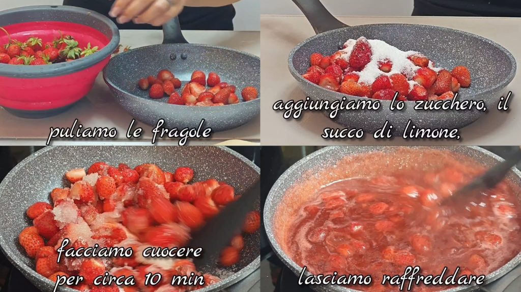Währenddessen die Erdbeeren putzen, in Stücke schneiden und mit Zucker sowie Zitronensaft in einen kleinen Topf geben. Etwa 10 Minuten kochen lassen, dabei ab und zu umrühren. Abkühlen lassen.