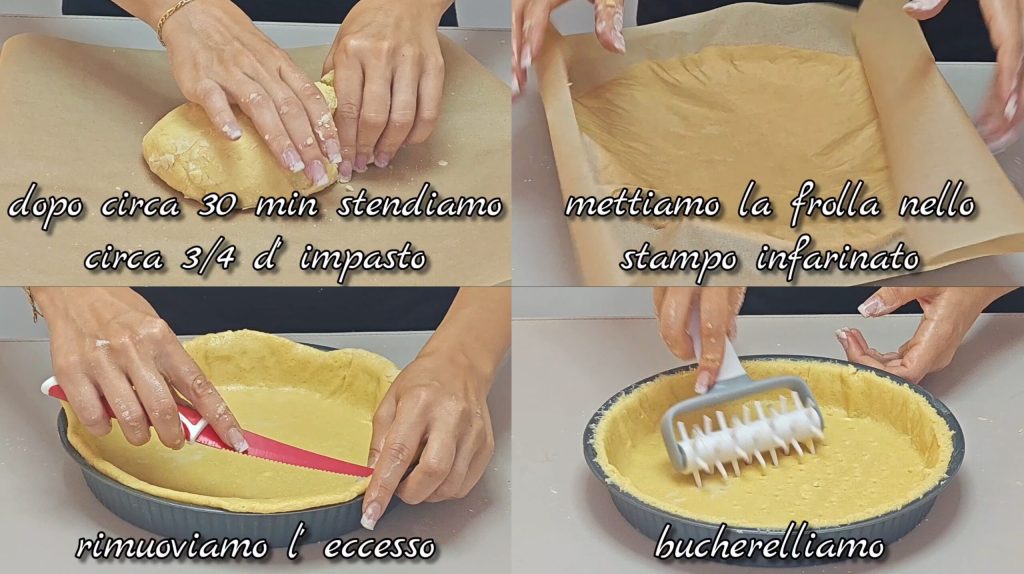 Den Mürbeteig aus dem Kühlschrank nehmen: etwa 3/4 des Teigs auf Backpapier ausrollen und in die bemehlte Form legen. Ränder abschneiden und den Boden mit einer Gabel einstechen.