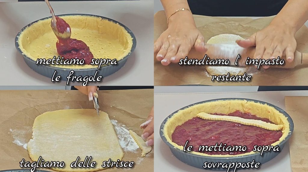 Die kalte Erdbeerfüllung auf den Boden geben. Den restlichen Teig ausrollen, Streifen schneiden und diese leicht überlappend auf die Tarte legen. In einem statischen Ofen bei 180°C für 40–50 Minuten backen. Vor dem Servieren abkühlen lassen.