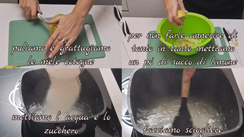 Zuerst wasche die Quitten gründlich und reibe sie. Um sie nicht zu sehr bräunen zu lassen, gib ab und zu etwas Zitronensaft darauf. In einem Topf gib das Wasser und den Zucker und lasse es schmelzen.