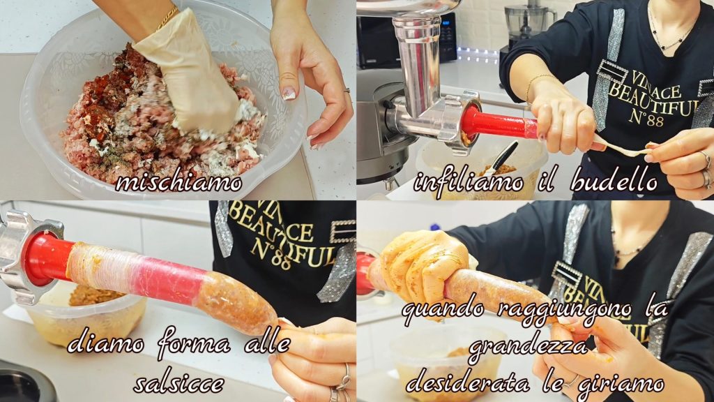Nachdem das Fleisch sorgfältig ausgewählt wurde (es sollte 60/70% mager und 30/40% fett sein), wird es gehackt. Wir fügen die Gewürze hinzu: Salz, Pfeffer, Paprika, Knoblauch (ich habe ihn püriert, um keine Stücke zu finden).