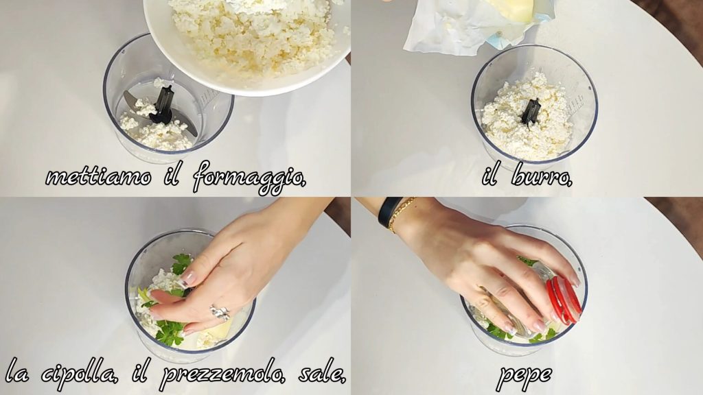 Zuerst geben wir den Käse, die Butter, die Zwiebel, die Petersilie, Salz, Pfeffer und andere Gewürze nach Belieben in den Mixerbehälter.