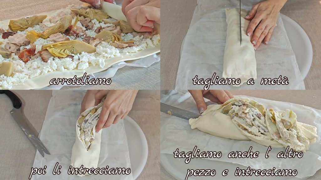 Eine Flechtrolle aus Blätterteig, gefüllt mit Ricotta, in Öl eingelegten Artischocken und Schweinebraten. Ein großartiger Vorspeise für die Weihnachtszeit und nicht nur. Die Flechtrolle ist sehr einfach zuzubereiten und sieht wunderbar aus, also wenn Sie ein einfaches aber beeindruckendes Rezept suchen, probieren Sie dieses! Wenn Ihnen Flechtrollen gefallen, probieren Sie auch diese Rezepte aus: Angelika-Flechtrolle mit Lachs, Flechtrolle mit Friarielli und Wurst, Herzhafte Brioche-Flechtrolle (ohne Ei), etc.
