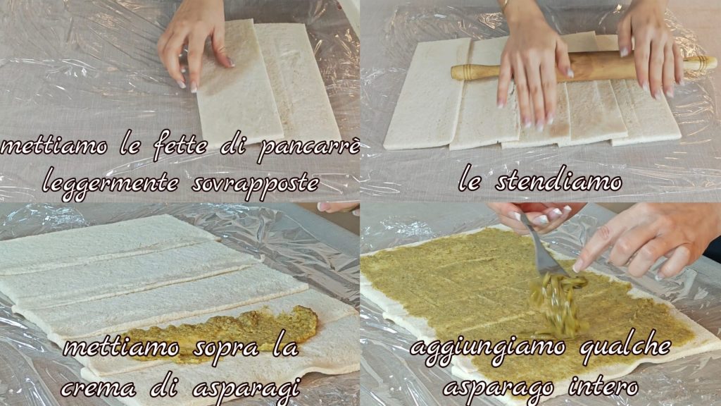 Zuerst legen wir die Scheiben Toastbrot leicht überlappend in eine Reihe und rollen sie aus. Wir bestreichen sie mit Spargelcreme und fügen einige ganze Spargel hinzu.