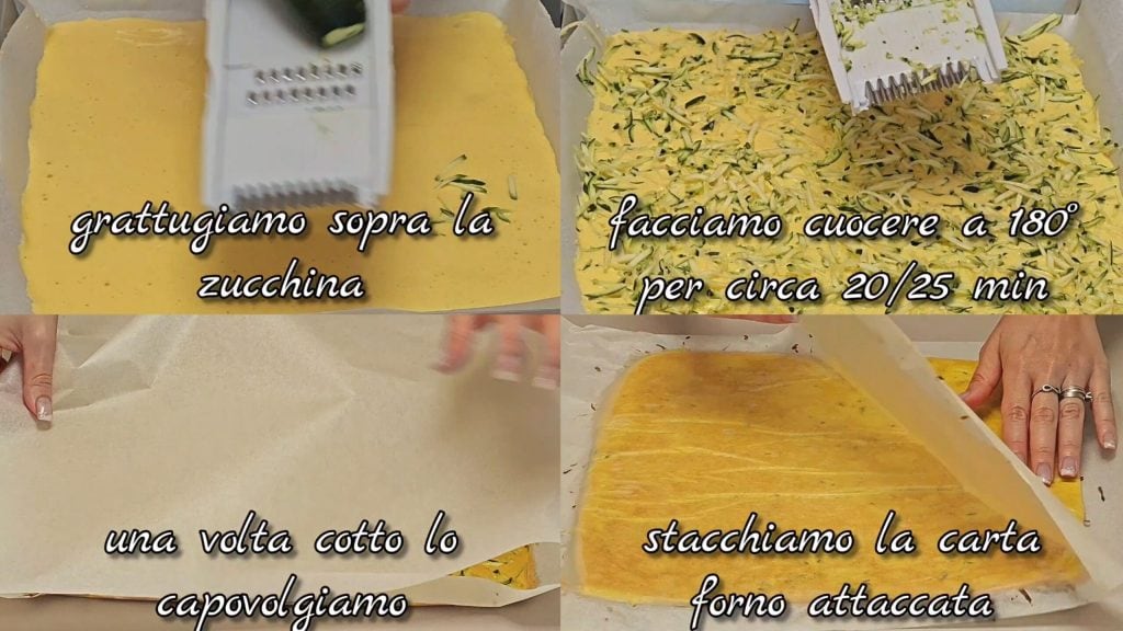 Zucchini darüber reiben. Bei 180° etwa 20/25 Minuten backen. Nach dem Backen umdrehen und das Backpapier entfernen
