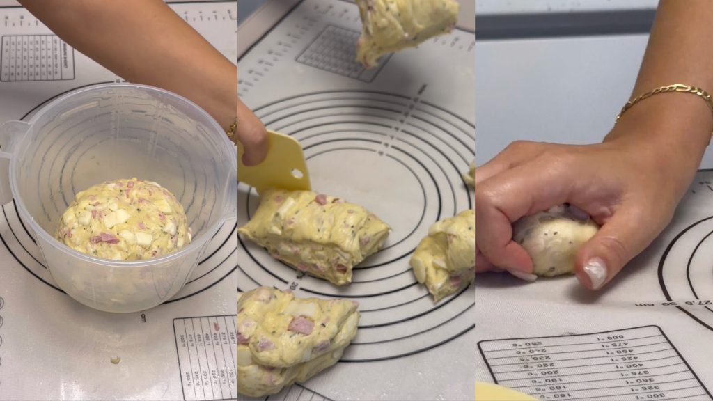 • Wenn der Teig an Konsistenz gewinnt, füge das Öl und die weiche Butter hinzu. Arbeite weiter, bis ein glatter und elastischer Teig entsteht (von Hand 10-12 Minuten, im Planetenmixer 6-7 Minuten). Zum Schluss das Salz hinzufügen. Füge den gewürfelten Schinken und Käse hinzu und vermische alles.