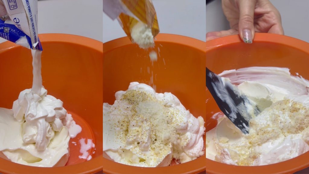 Sahne mit einer Prise Salz und Pfeffer mischen.