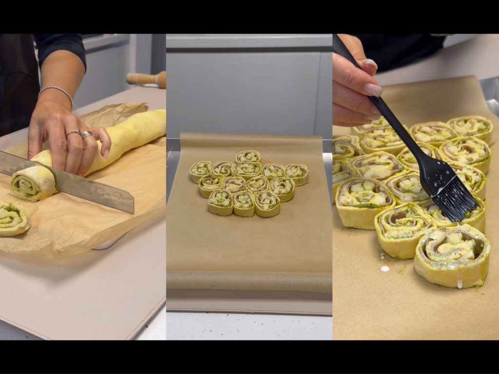 Nach der Ruhezeit schneiden Sie die Rolle in 2–3 cm dicke Scheiben. Legen Sie die Schnecken auf ein mit Backpapier ausgelegtes Backblech und formen Sie einen Weihnachtsbaum. Bestreichen Sie die Oberfläche mit etwas Milch. Backen Sie im vorgeheizten Ofen bei 180°C für etwa 25 Minuten, bis die Schnecken goldbraun sind und der Blätterteig aufgeht.