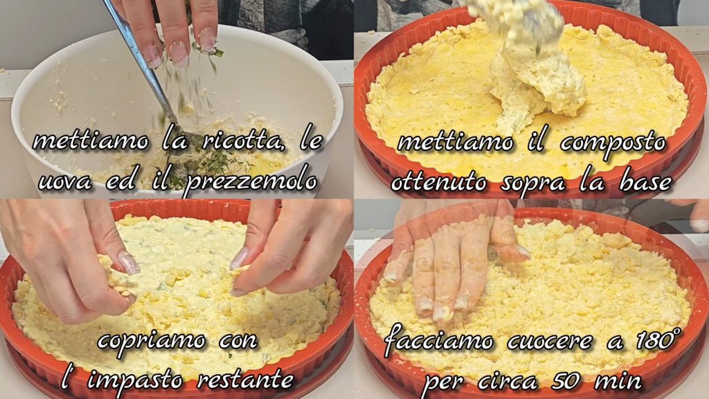 In eine Schüssel geben wir die Ricotta, die Eier, die Petersilie, etwas Salz und Gewürze nach Belieben. Die erhaltene Füllung auf den Boden geben und mit dem restlichen zerbröckelten Teig bedecken. Bei 180° etwa 50 Minuten backen.