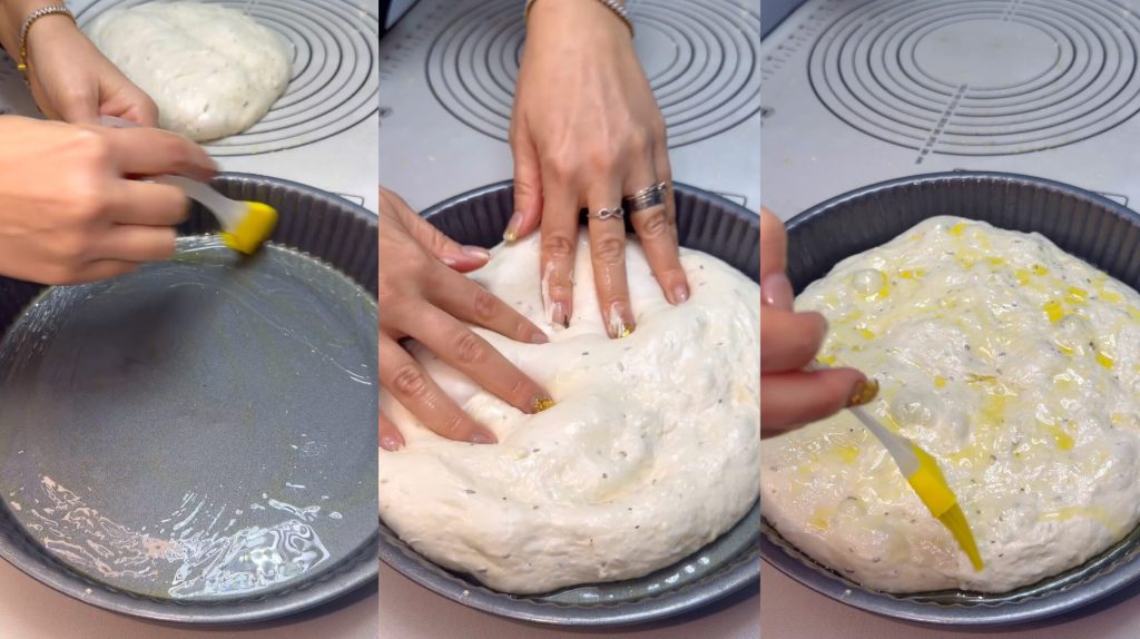 • Wir fetten die Form oder das Backblech gut ein, legen den Teig hinein und bestreichen ihn mit Öl. Abdecken und erneut gehen lassen, bis sich das Volumen verdoppelt hat.