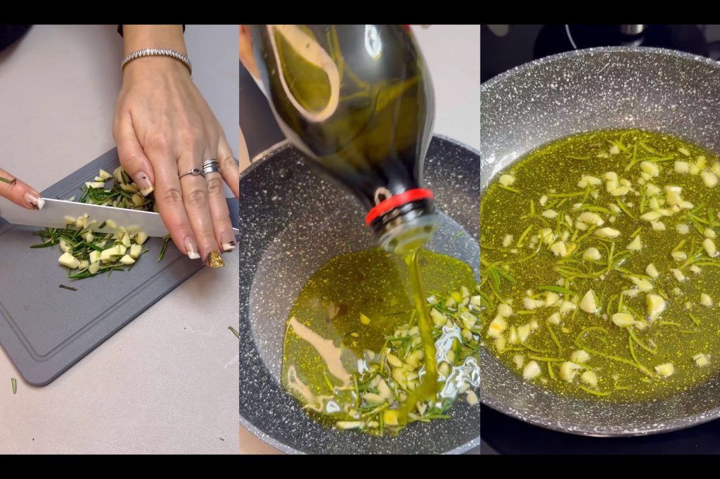 In der Zwischenzeit den Rosmarin putzen und fein hacken. In einem kleinen Topf mit etwas extra nativem Olivenöl zusammen mit dem Knoblauch leicht anbraten. Abkühlen lassen.