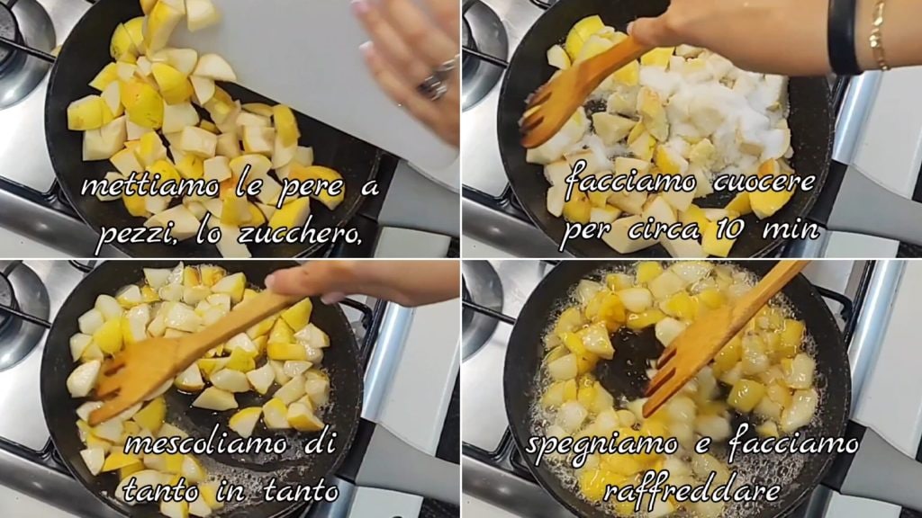 In einem Topf die Birnenstücke mit dem Zucker geben und etwa 10 Minuten kochen, dabei gelegentlich umrühren. Vom Herd nehmen und abkühlen lassen.