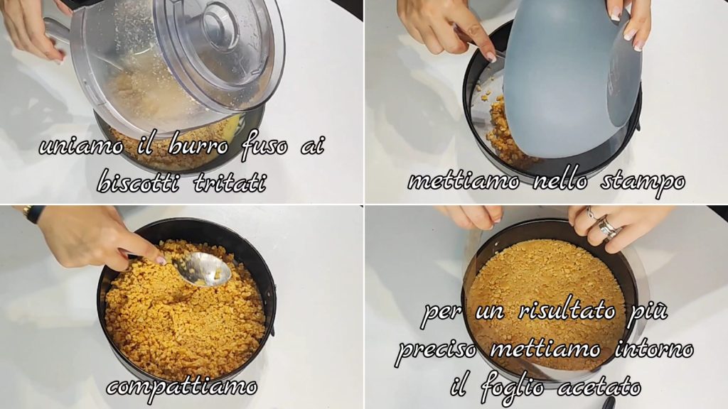 In einer Schüssel die zerbröselten Kekse mit der geschmolzenen Butter gut vermengen. Diese Masse in die mit Backpapier ausgelegte Form auf den Boden geben und gut festdrücken. Für ein präziseres Ergebnis können wir ein Acetatblatt am Rand befestigen.