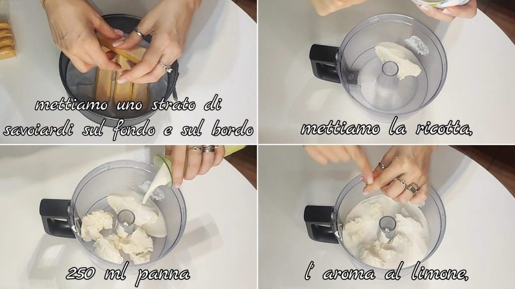 Legen Sie eine Schicht Löffelbiskuits auf den Boden und den Rand der Form (legen Sie zuerst Backpapier auf den Boden). In einer Schüssel die Ricotta, 250 ml Sahne und das Zitronenaroma mischen.