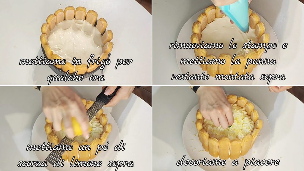 Etwas Zitronenschale, Zucker hinzufügen und schlagen. Die erhaltene Creme in die Form mit den Löffelbiskuits geben. Glätten.