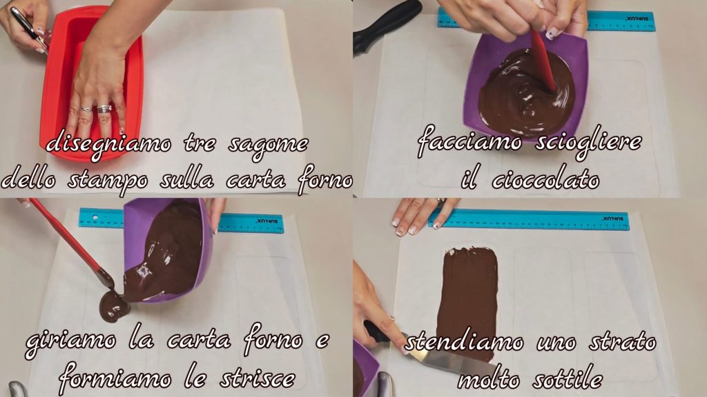Zuerst nehmen wir ein Blatt Backpapier und zeichnen mit einem Bleistift drei Umrisse der Form, die wir verwenden werden. In der Zwischenzeit schmelzen wir die Schokolade und legen eine dünne Schicht über jede Form (wir müssen sie in 4 Teile teilen).