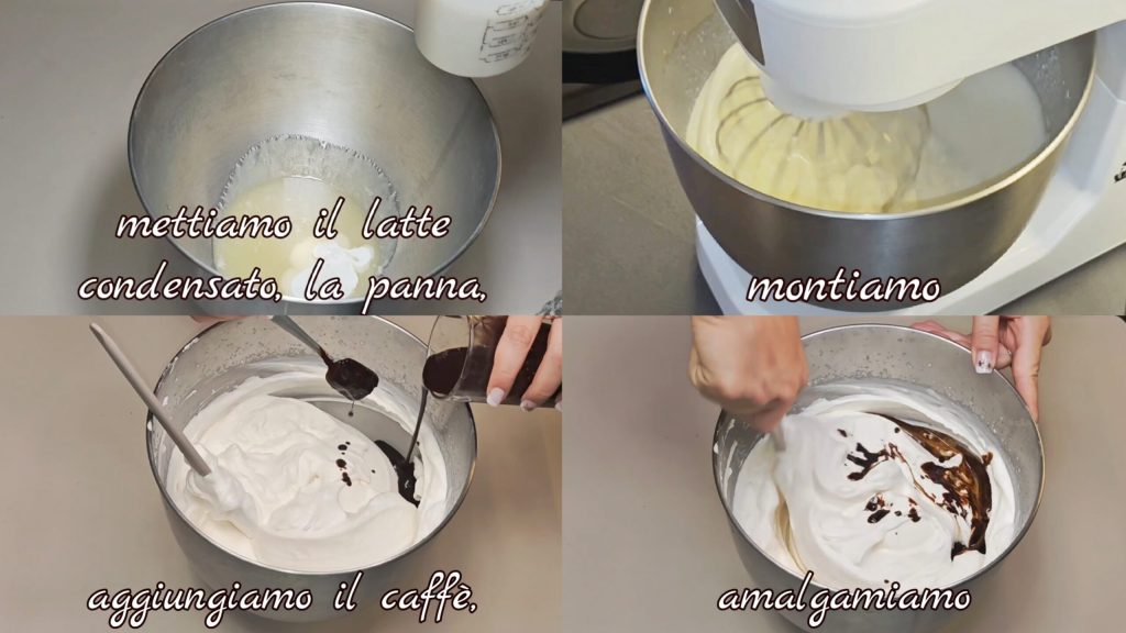 Wir geben die Kondensmilch, die Sahne hinzu und schlagen sie auf. Fügen Sie den Kaffee hinzu und rühren Sie um.