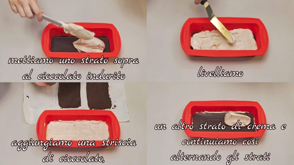 Wir beenden mit einer Cremeschicht, glätten sie gut, decken sie ab und legen sie für ein paar Stunden in den Gefrierschrank. Danach entfernen wir die Form und dekorieren nach Belieben.