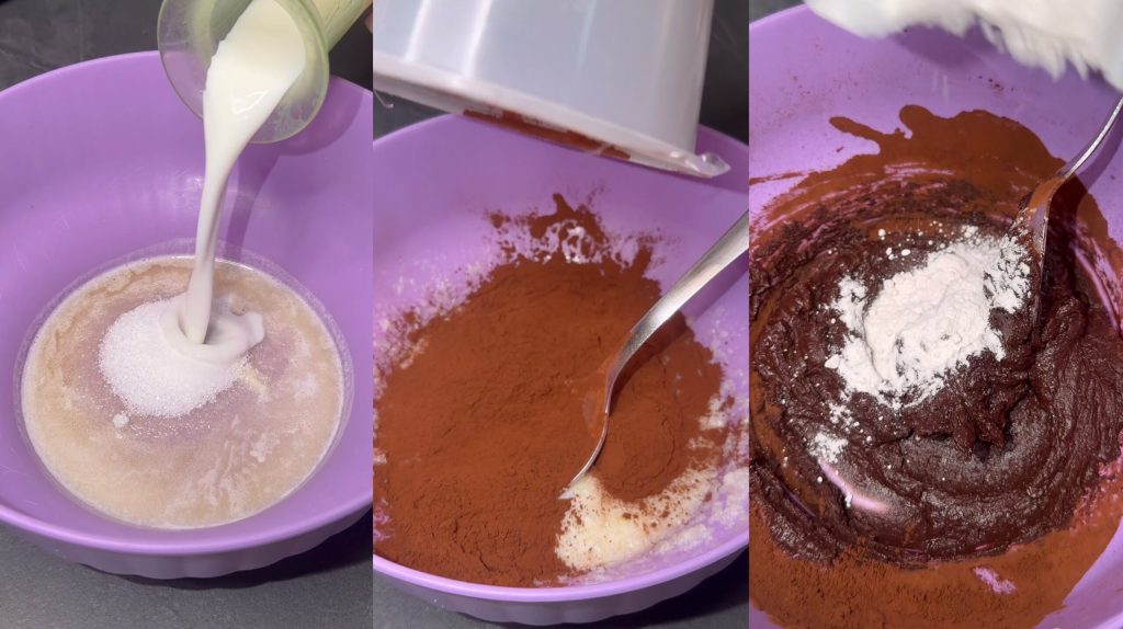 In eine Schüssel geben wir die geschmolzene Butter, Zucker und Milch. Gut mischen. Fügen Sie den Kakao, das Backpulver hinzu