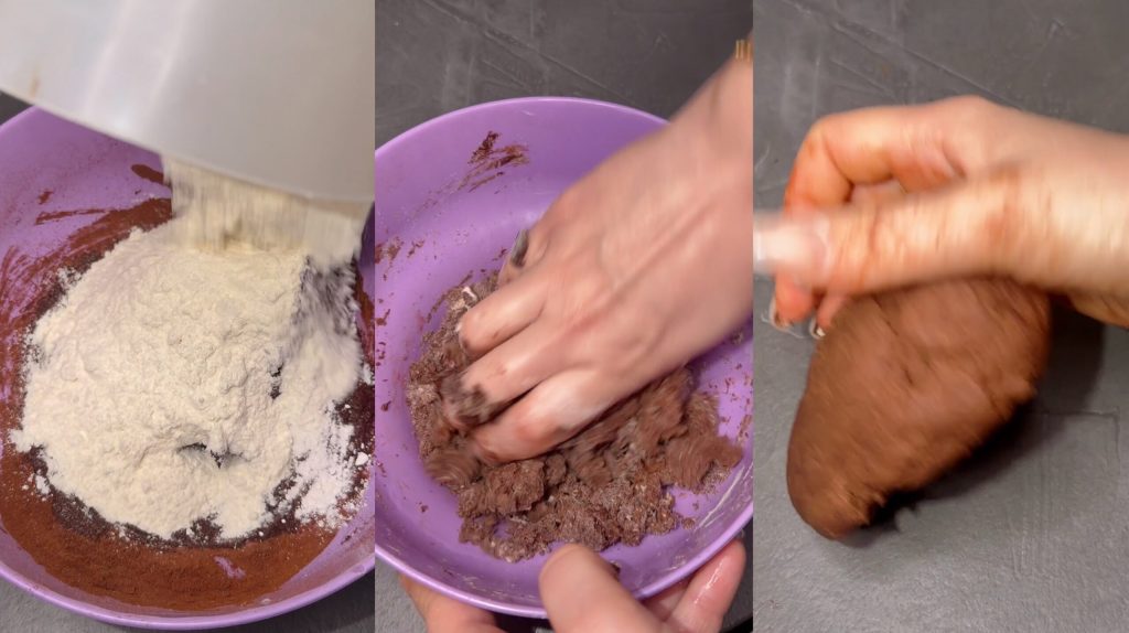 Den Teig in Frischhaltefolie wickeln und im Kühlschrank etwa 30 Minuten ruhen lassen. Nach der Ruhezeit den Teig wieder aufnehmen und in mehrere Teile teilen. Rollen formen,