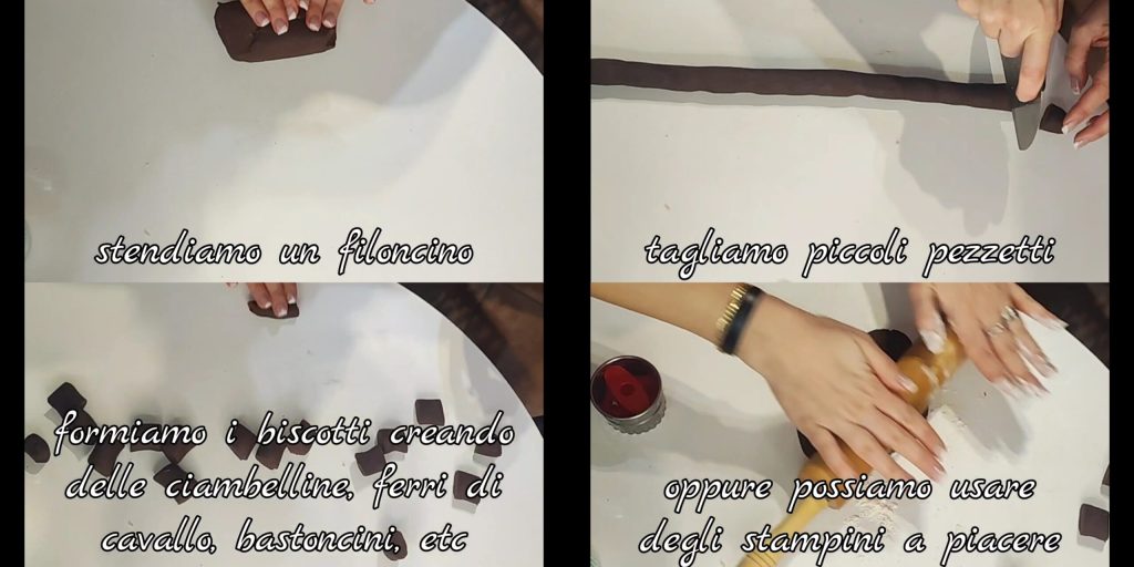 Zuerst habe ich eine Rolle geformt, dann in Stücke geschnitten und verschiedene Formen gemacht (Kringel, Hufeisen, Stäbchen usw.) oder wir können verschiedene Ausstecher nach Belieben verwenden.