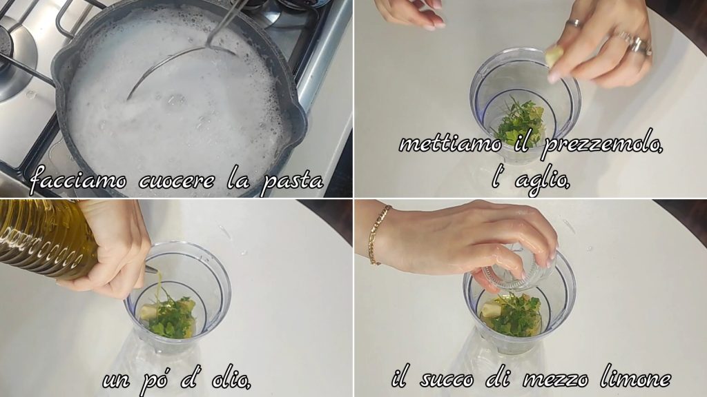 Zuerst kochen wir die Pasta in Salzwasser. In der Zwischenzeit geben wir die Petersilie, den Knoblauch, etwas Öl und den Saft einer halben Zitrone hinzu.