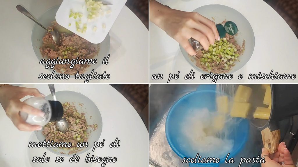 Wir fügen den geschnittenen Sellerie, etwas Oregano und etwas Salz hinzu, wenn es nötig ist. Wir seihen die Pasta ab.