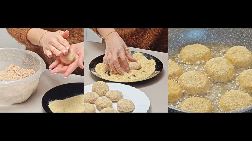Jeweils eine kleine Menge der Masse nehmen und Bällchen formen. In Semmelbrösel wenden und so weitermachen, bis die Masse aufgebraucht ist.