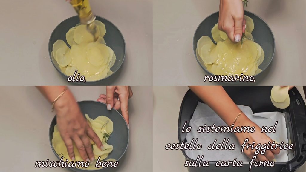 Etwas Öl und Rosmarin hinzufügen und gut mischen. Wir legen sie in den Korb der Heißluftfritteuse mit Backpapier darin.