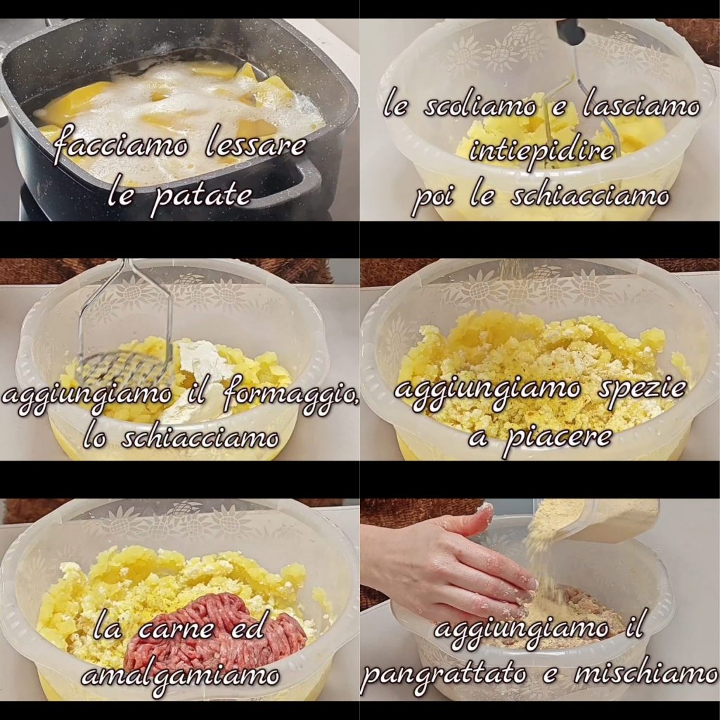Zuerst die Kartoffeln kochen, dann abtropfen lassen und abkühlen lassen. Dann zerdrücken und den Käse hinzufügen. Gewürze nach Belieben und das Hackfleisch hinzufügen, dann gut vermischen. Zum Schluss die Semmelbrösel hinzufügen.