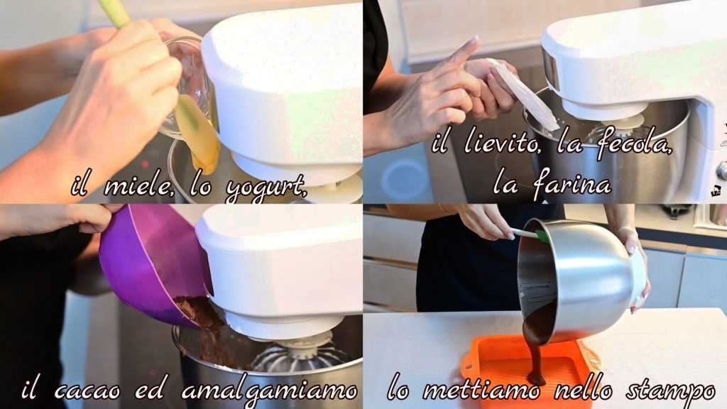 Wir fügen den Honig, den Joghurt, das Backpulver, die Stärke und das Mehl hinzu und vermengen alles. Wir geben die Mischung in eine Form.
