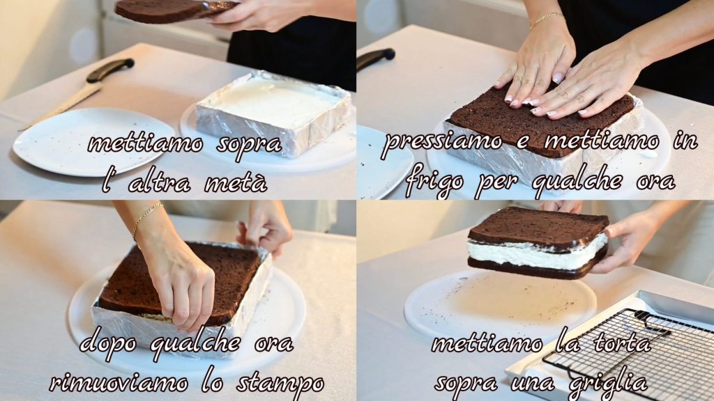Wir legen die andere Hälfte darauf, drücken leicht und stellen sie für einige Stunden in den Kühlschrank. Nach einigen Stunden entfernen wir die Form und stellen sie auf ein Gitter.
