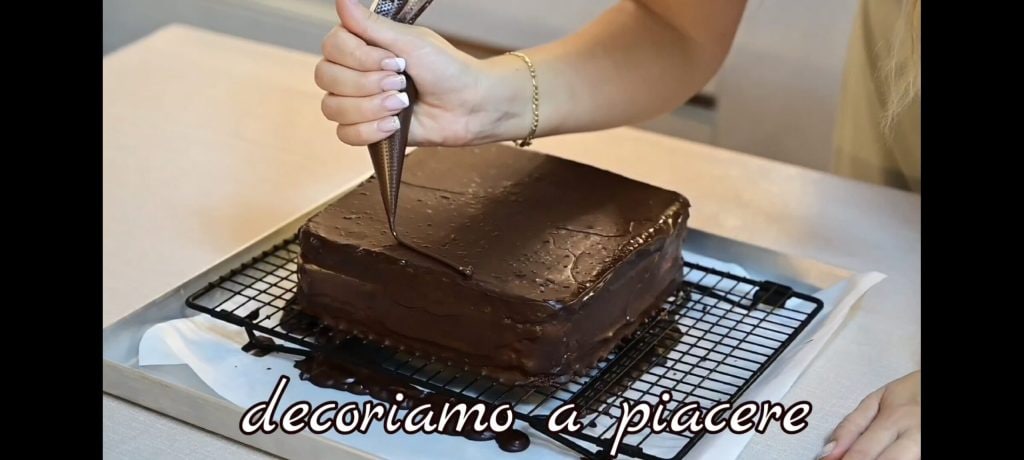 Wir geben die heiße Sahne über die Schokolade und verrühren, bis sie gut geschmolzen ist, dann glasieren wir den Kuchen. Wir stellen ihn für mindestens 30 Minuten in den Kühlschrank.