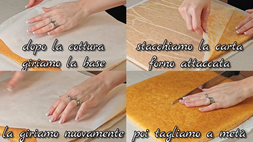 Nach dem Backen drehen wir die Basis um und lösen das darauf befestigte Backpapier ab. Wir drehen es erneut und schneiden es in der Mitte durch.
