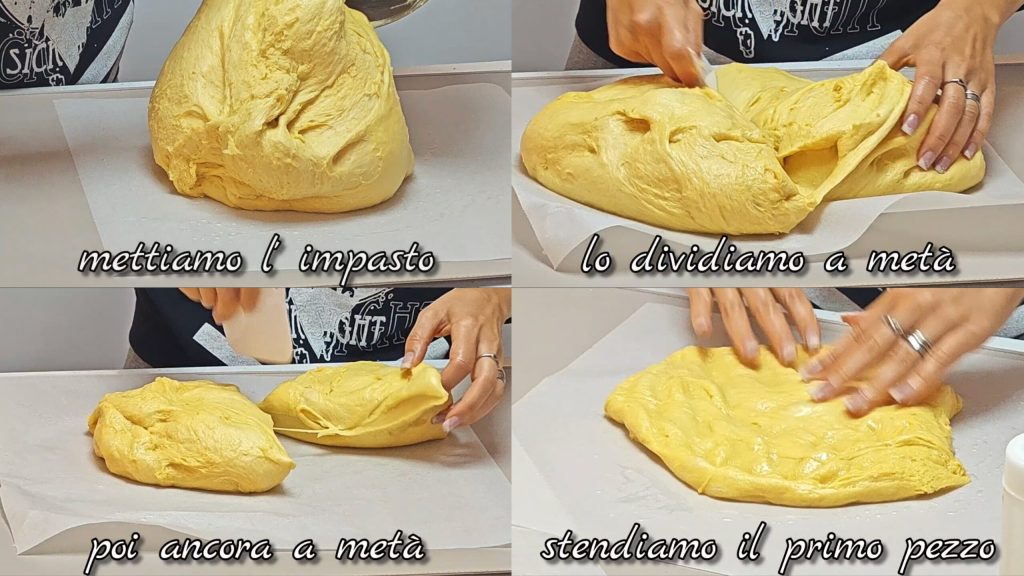 Teilen Sie ihn zunächst in der Mitte und dann nochmals in der Mitte: mit diesen Mengen erhalten Sie zwei geflochtene Panettoni.