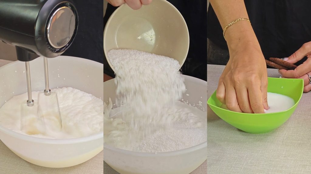 Schlage die Sahne mit dem Zucker steif. Füge vorsichtig die Kokosraspeln hinzu und mische sie mit einem Spatel unter, um eine weiche Creme zu erhalten.