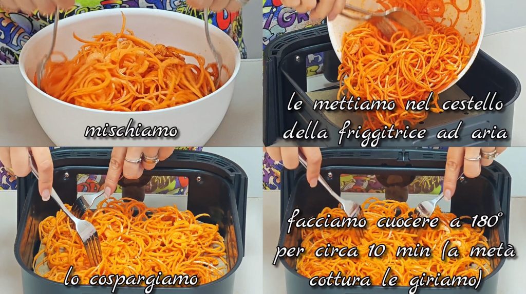 Gut mischen, damit alle Kartoffeln gut gewürzt sind. Die Kartoffelfäden in den Korb der Heißluftfritteuse geben und gleichmäßig verteilen. Bei 180°C etwa 10 Minuten garen, zur Hälfte der Garzeit wenden, um eine gleichmäßige Bräunung zu erzielen.