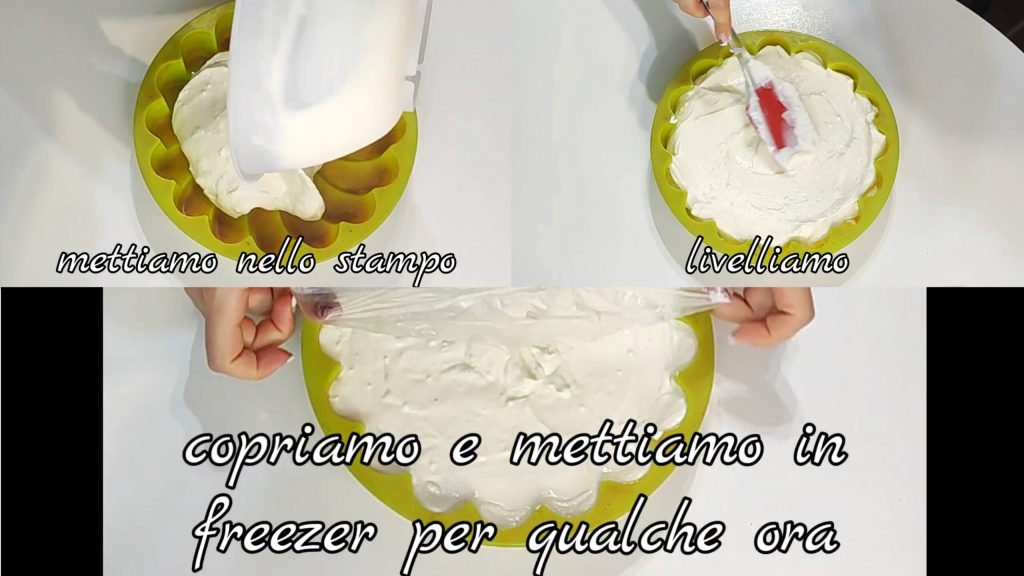 Die erhaltene Mischung in eine beliebige Form geben (besser, wenn sie aus Silikon ist, andernfalls den Boden der Form mit Folie auslegen). Glätten und leicht klopfen, um eventuell Luft entweichen zu lassen, abdecken und für ein paar Stunden in den Gefrierschrank stellen.