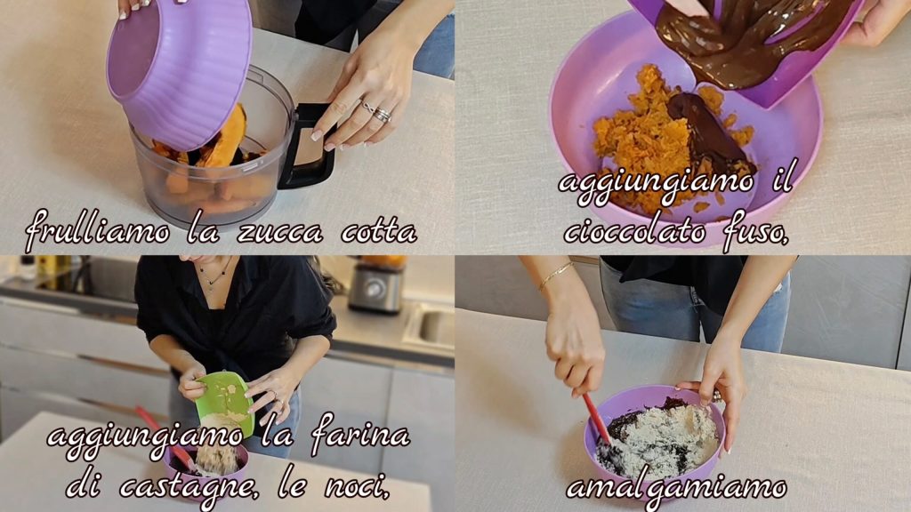• Zuerst den bereits gekochten Kürbis pürieren (ich habe ihn in der Heißluftfritteuse gekocht). Schmelzen Sie die Schokolade und mischen Sie sie darunter. Fügen Sie das Kastanienmehl, die Nüsse hinzu und mischen Sie gut.